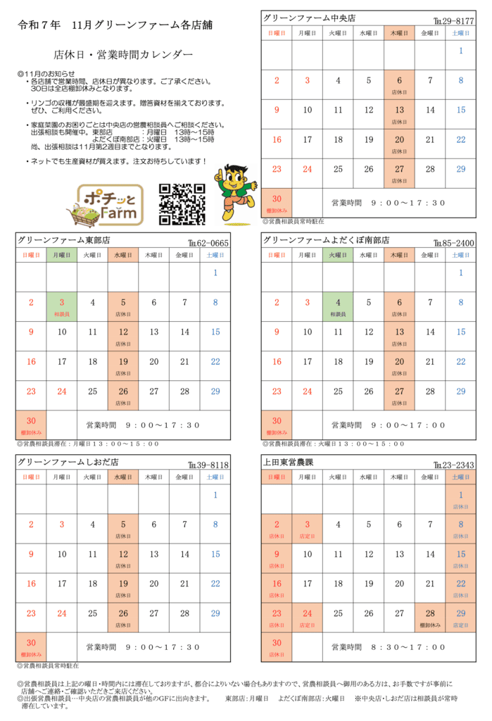 グリーンファーム各店 11月の営業について
