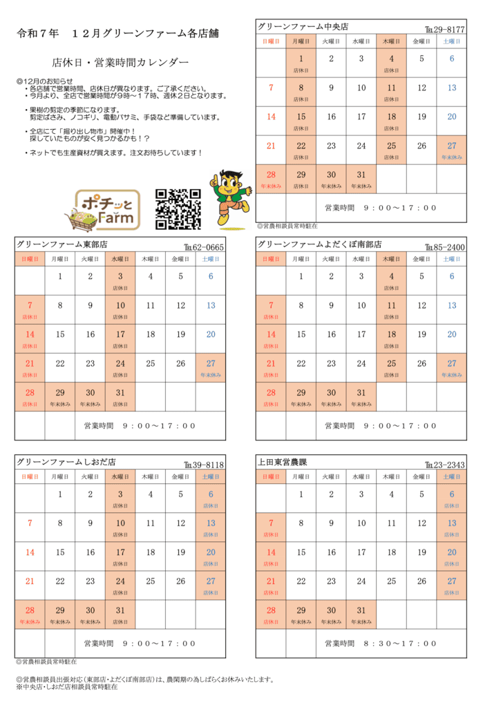 グリーンファーム各店 12月の営業について